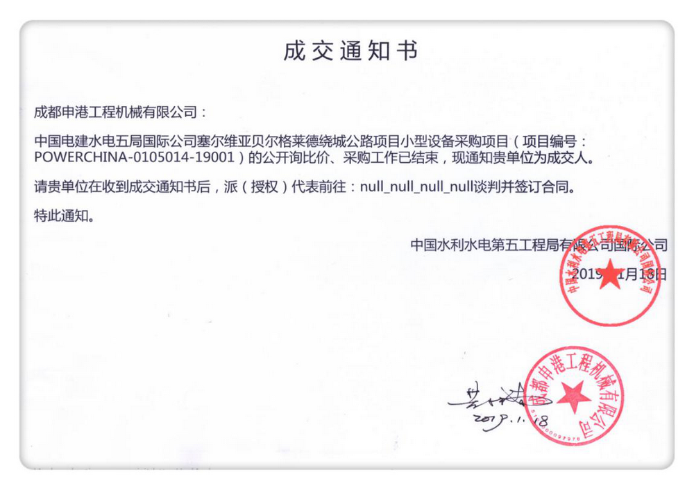2019年1月18日,我公司收到中國(guó)電建水電五局國(guó)際公司發(fā)來(lái)的關(guān)于塞爾維亞貝爾格萊德繞城公路項(xiàng)目小型設(shè)備采購(gòu)項(xiàng)目的“成交通知書”,我公司為成交人,目前該設(shè)備已用木箱包裝完畢,準(zhǔn)備發(fā)往指定港口。