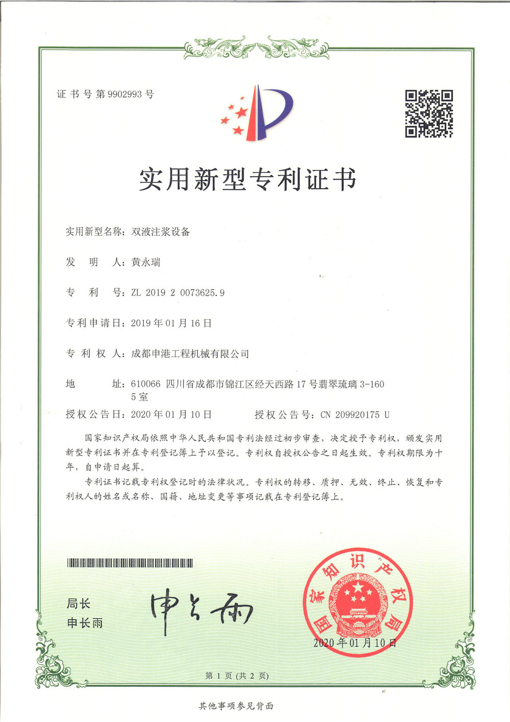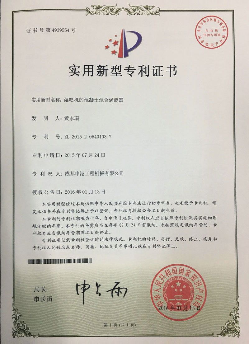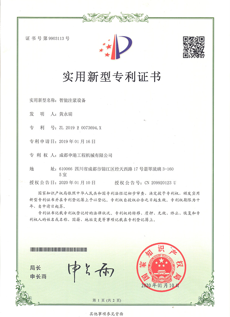智能注漿設(shè)備專利證書